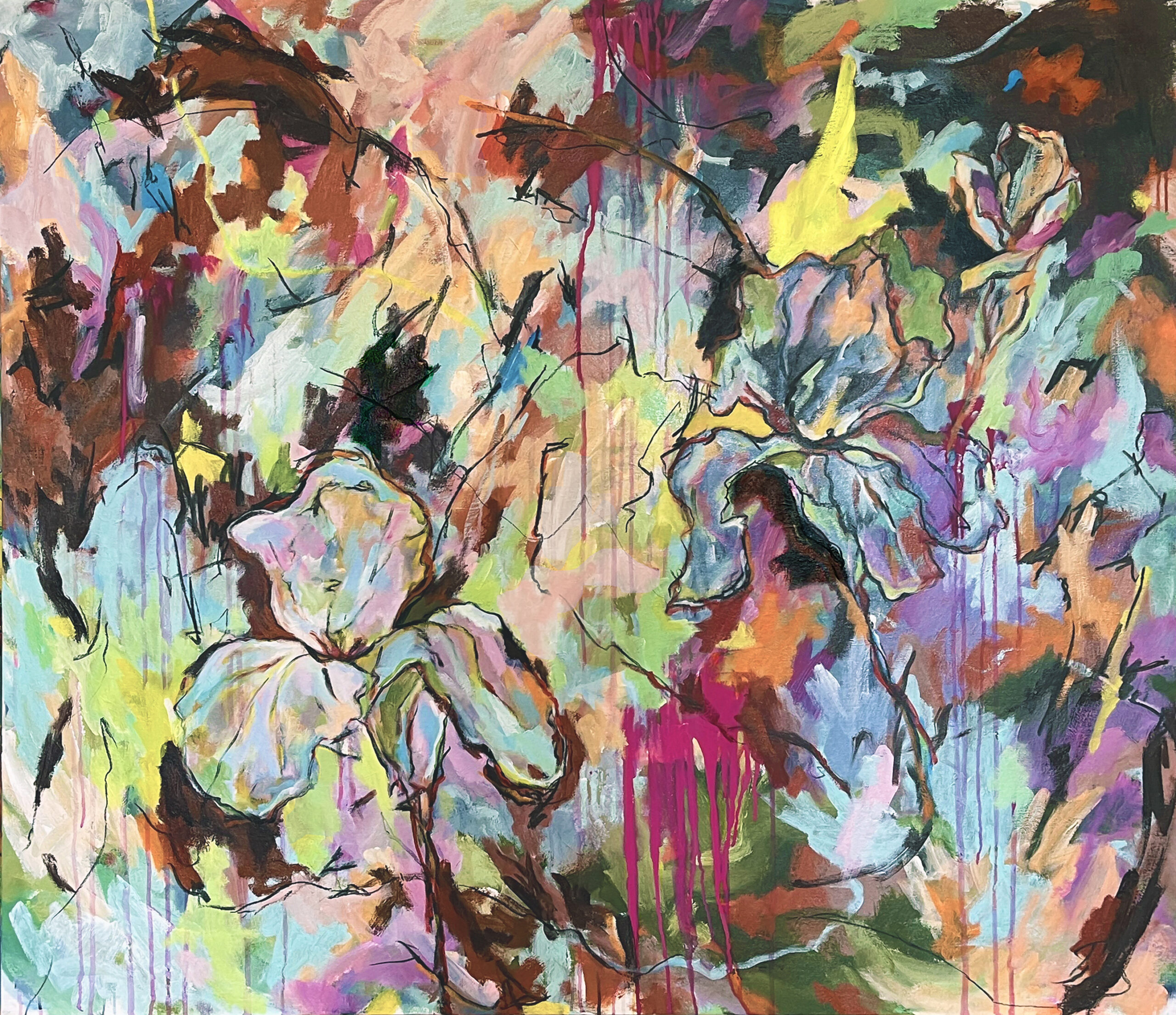 An evocative fusion of florals and feeling, Abstracting My Flowers by Julie Tugwell blurs the boundary between bloom and brushstroke. vivid hues dance in a kaleidoscope of motion, with expressive line work and dripping pigments revealing petals as memory, body, and metaphor. This large-scale canvas invites viewers into a world where vulnerability is rendered in colour — both joyful and raw, like flowers unfurling through chaos.
