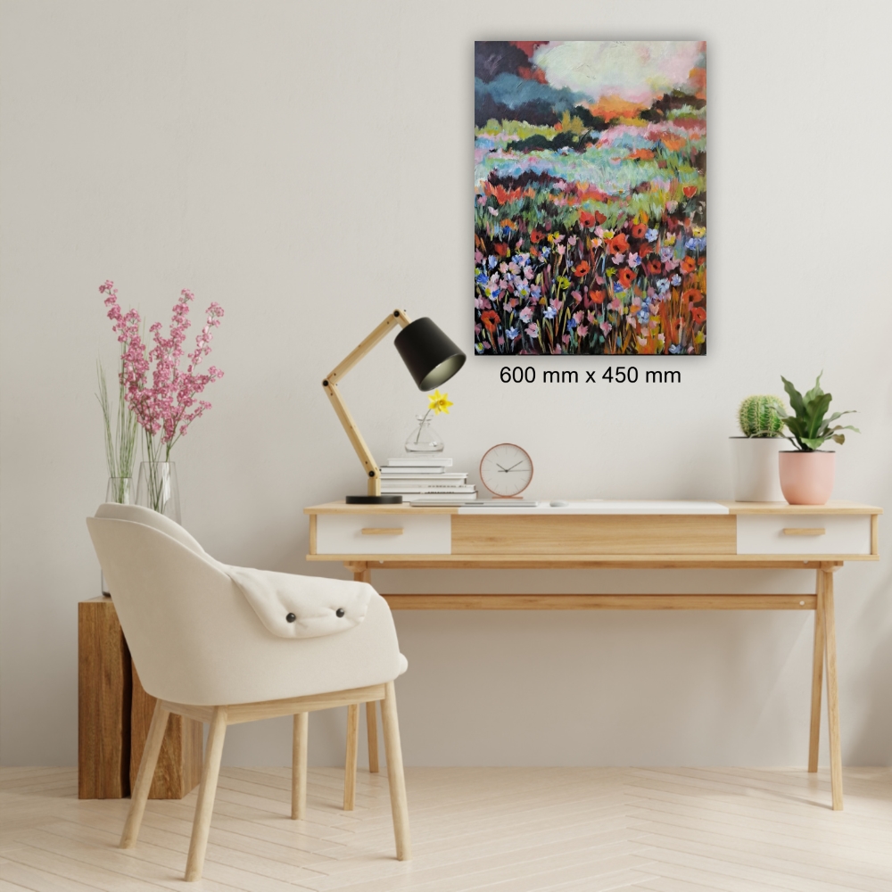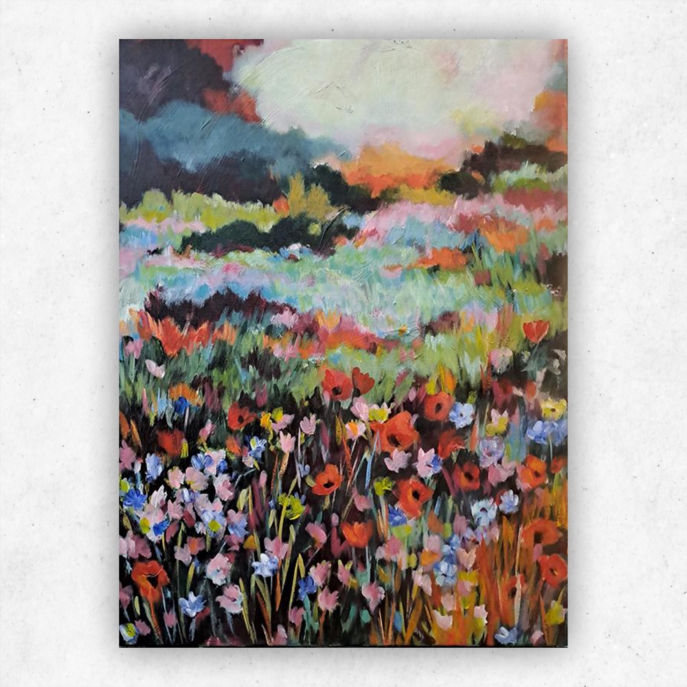 Similar to Fauvism, Julie Tugwell’s floral artworks are characterized by their vivid colour palettes and dynamic brushwork, capturing the essence of the subject rather than an exact likeness.” This valley of blooms painting is moody and
