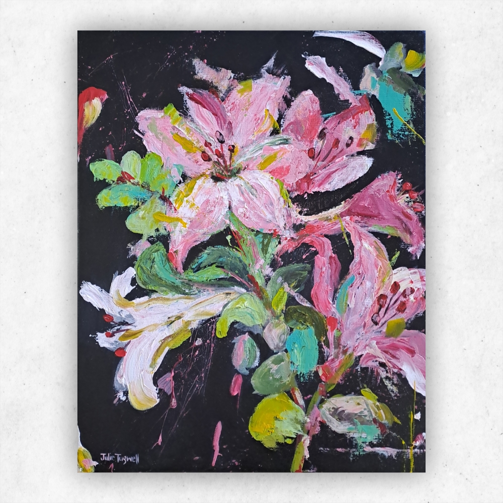 This striking canvas painting features a black background that beautifully accentuates the vibrant pinks and greens of the Lily flowers. Created by South African artist Julie Tugwell, this artwork showcases her unique technique, using her late father Chris Tugwell’s famous palette knives to produce bold brushstrokes and rich paint textures. Titled You Are One of My Nicest Thoughts, this painting is a heartfelt, artistic gesture of gratitude, symbolizing Julie’s appreciation for her boyfriend’s thoughtful gift of flowers. With its edgy yet elegant composition, this piece blends beauty, emotion, and creativity, making it the perfect addition to any contemporary art collection
